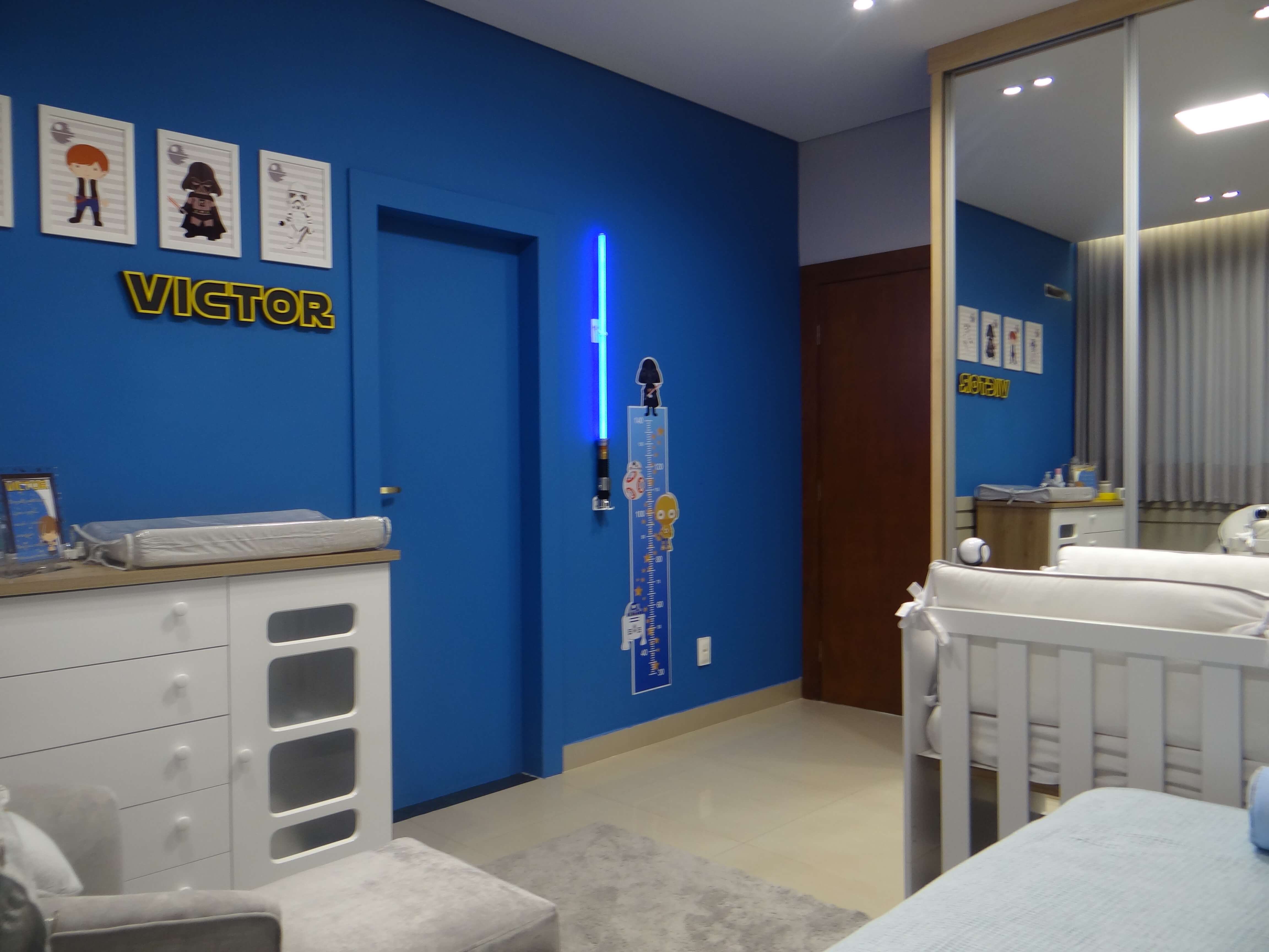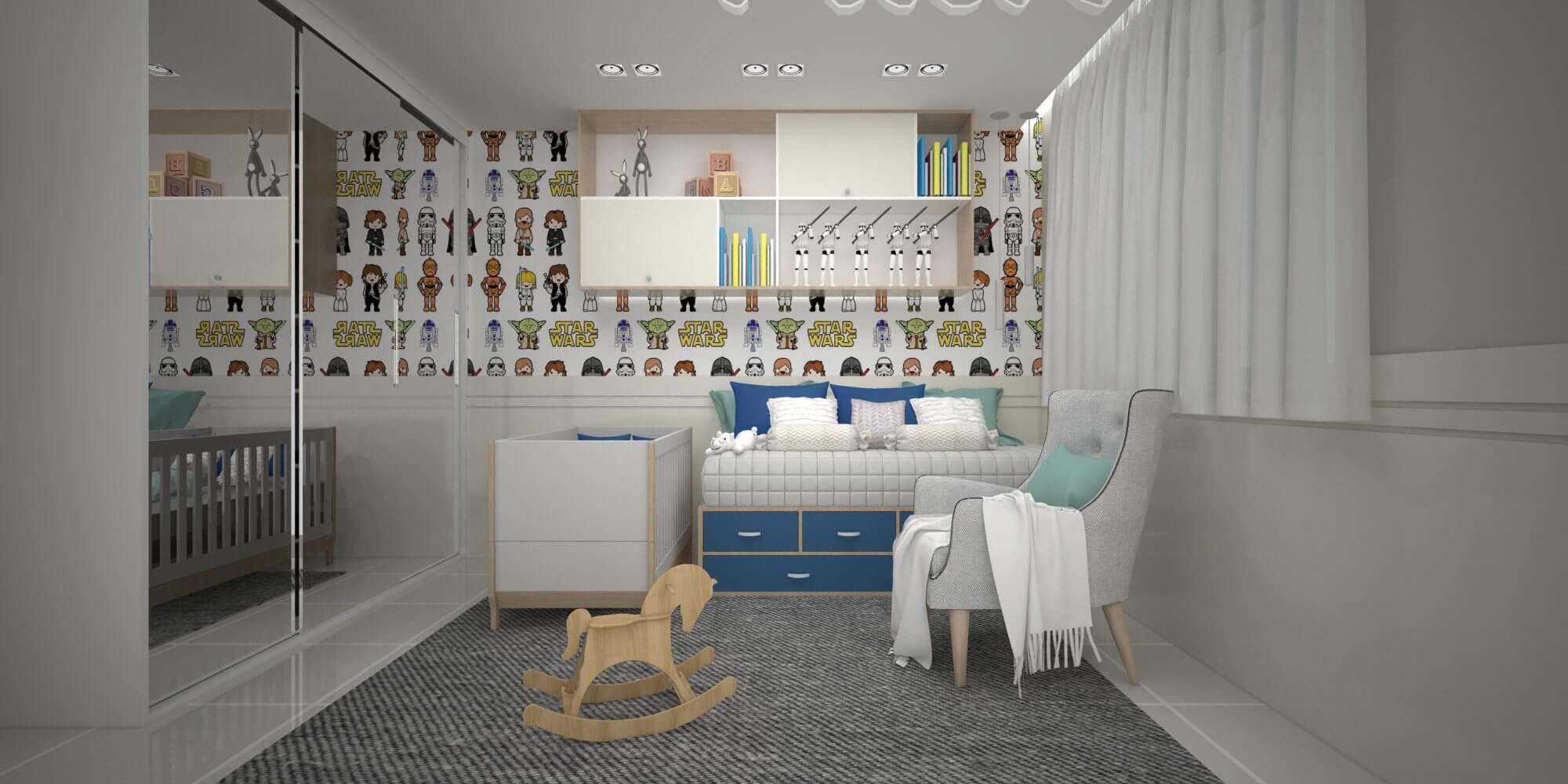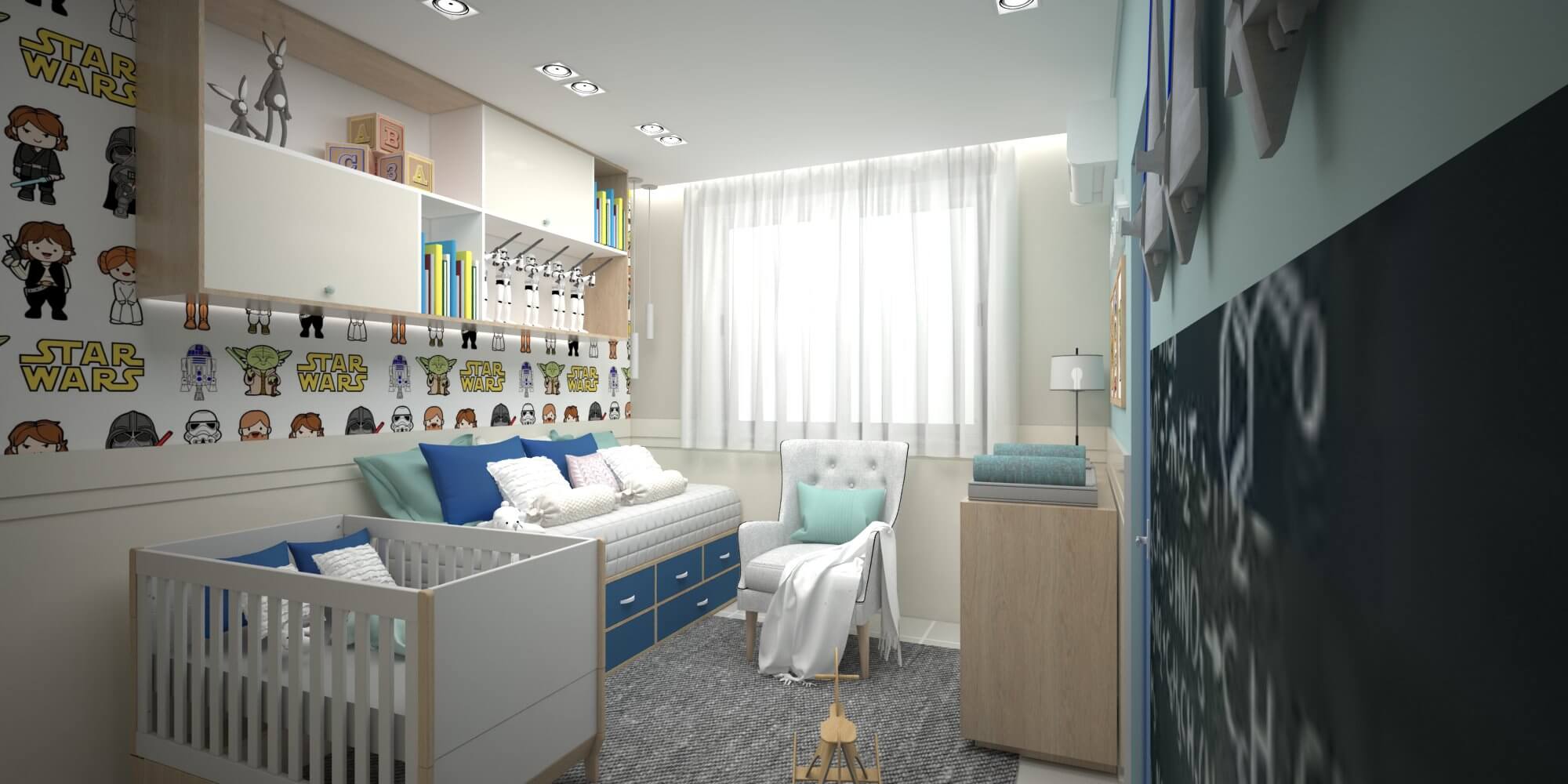 Fomos contactados pelos pais amantes de Star Wars que gostariam de aplicar o tema no quartinho do bebê ainda por vir. Utilizamos de vários truques tanto no layout como nas cores, deixando o ambiente bem atrativo e apropriado para a utilização dos pais e já adaptado ao crescimento do bebê.