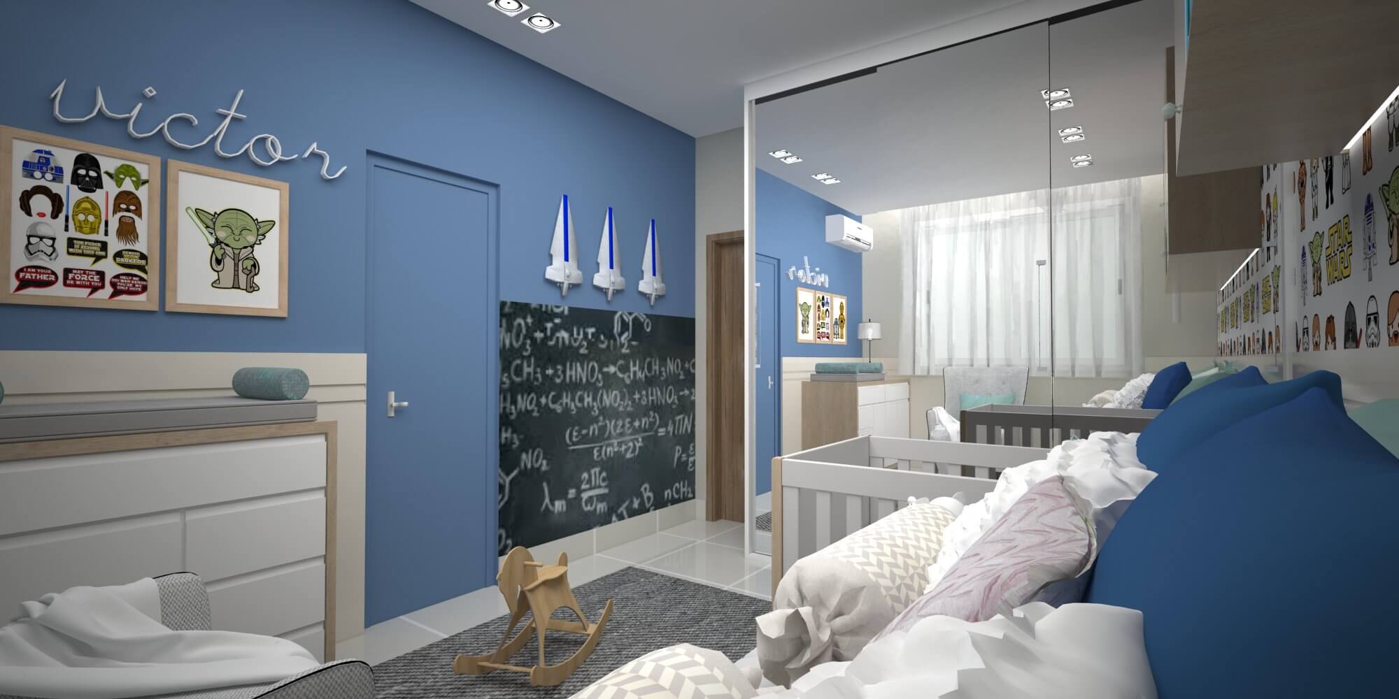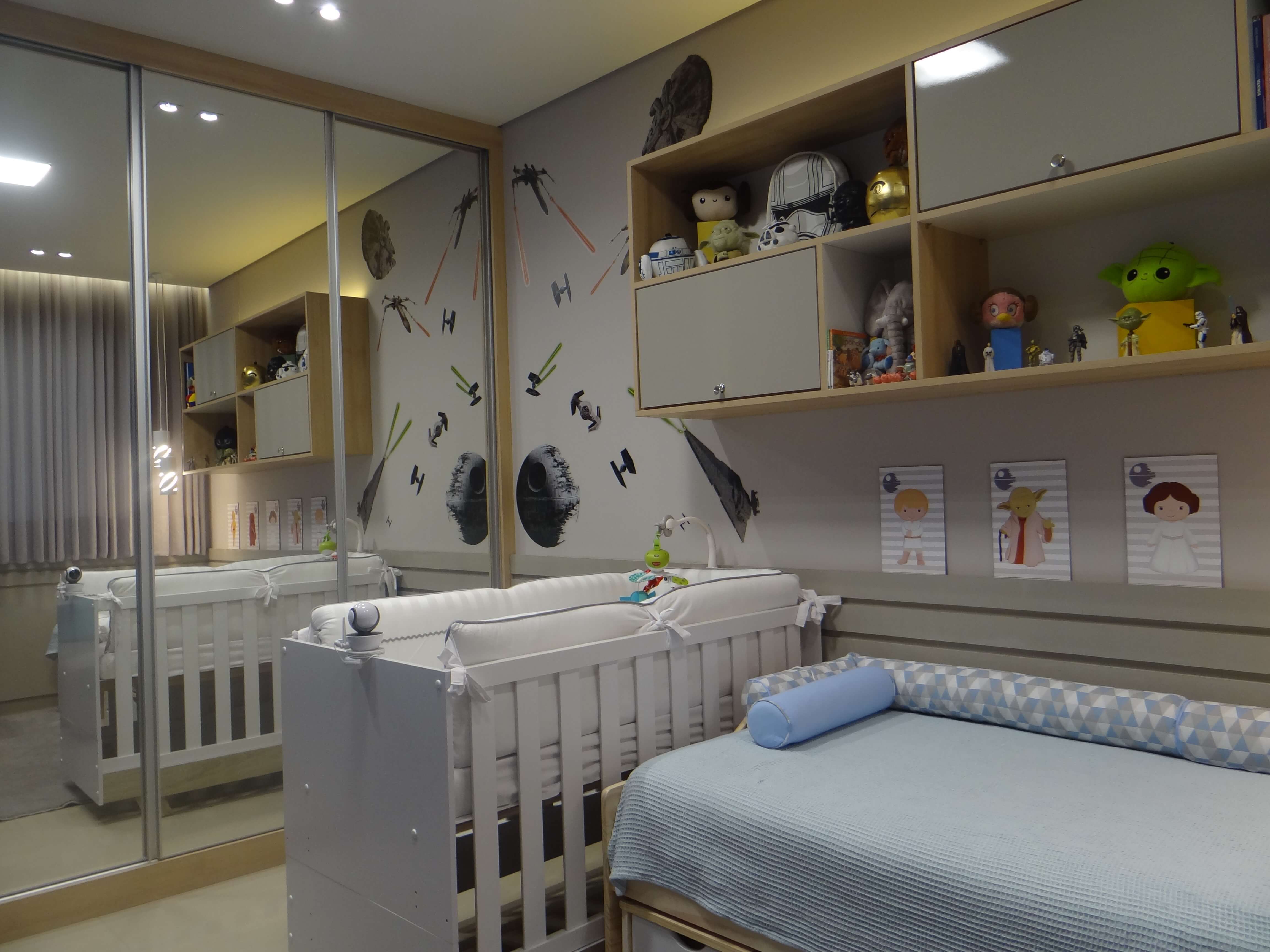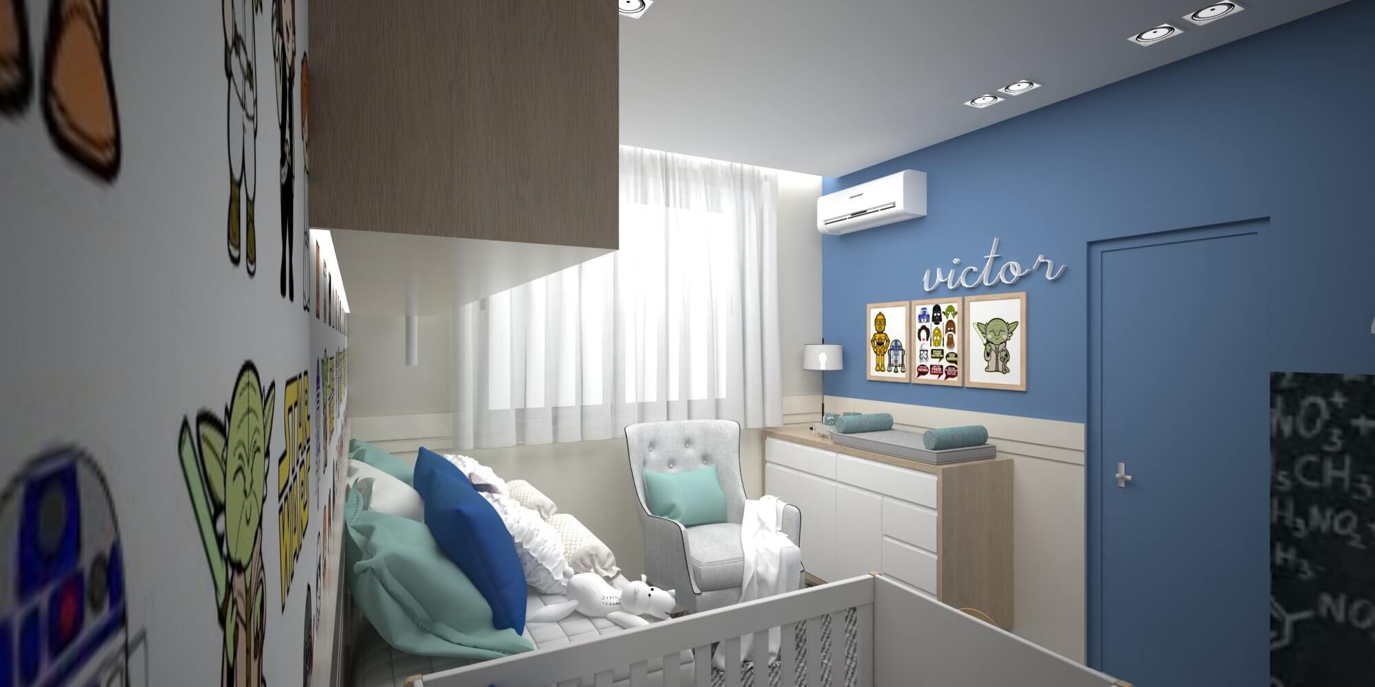 Fomos contactados pelos pais amantes de Star Wars que gostariam de aplicar o tema no quartinho do bebê ainda por vir. Utilizamos de vários truques tanto no layout como nas cores, deixando o ambiente bem atrativo e apropriado para a utilização dos pais e já adaptado ao crescimento do bebê.