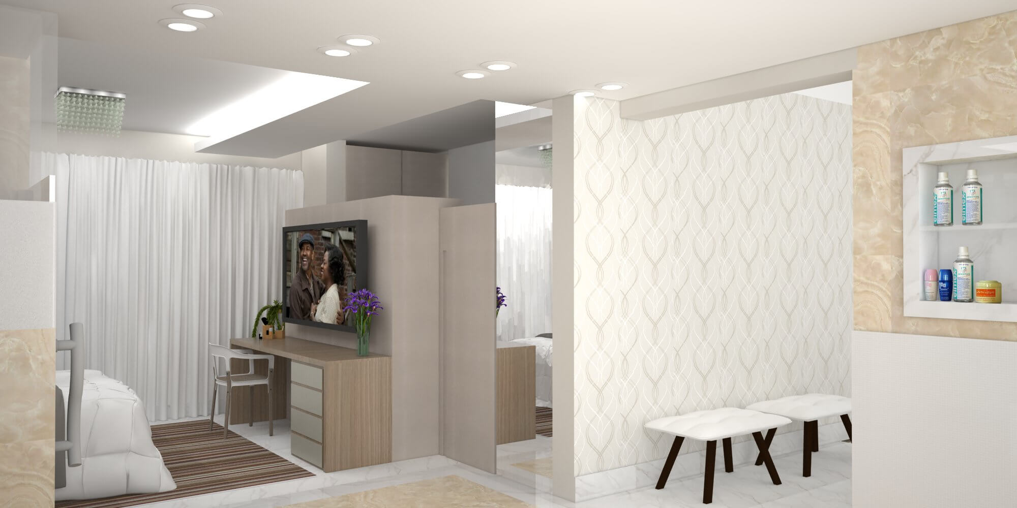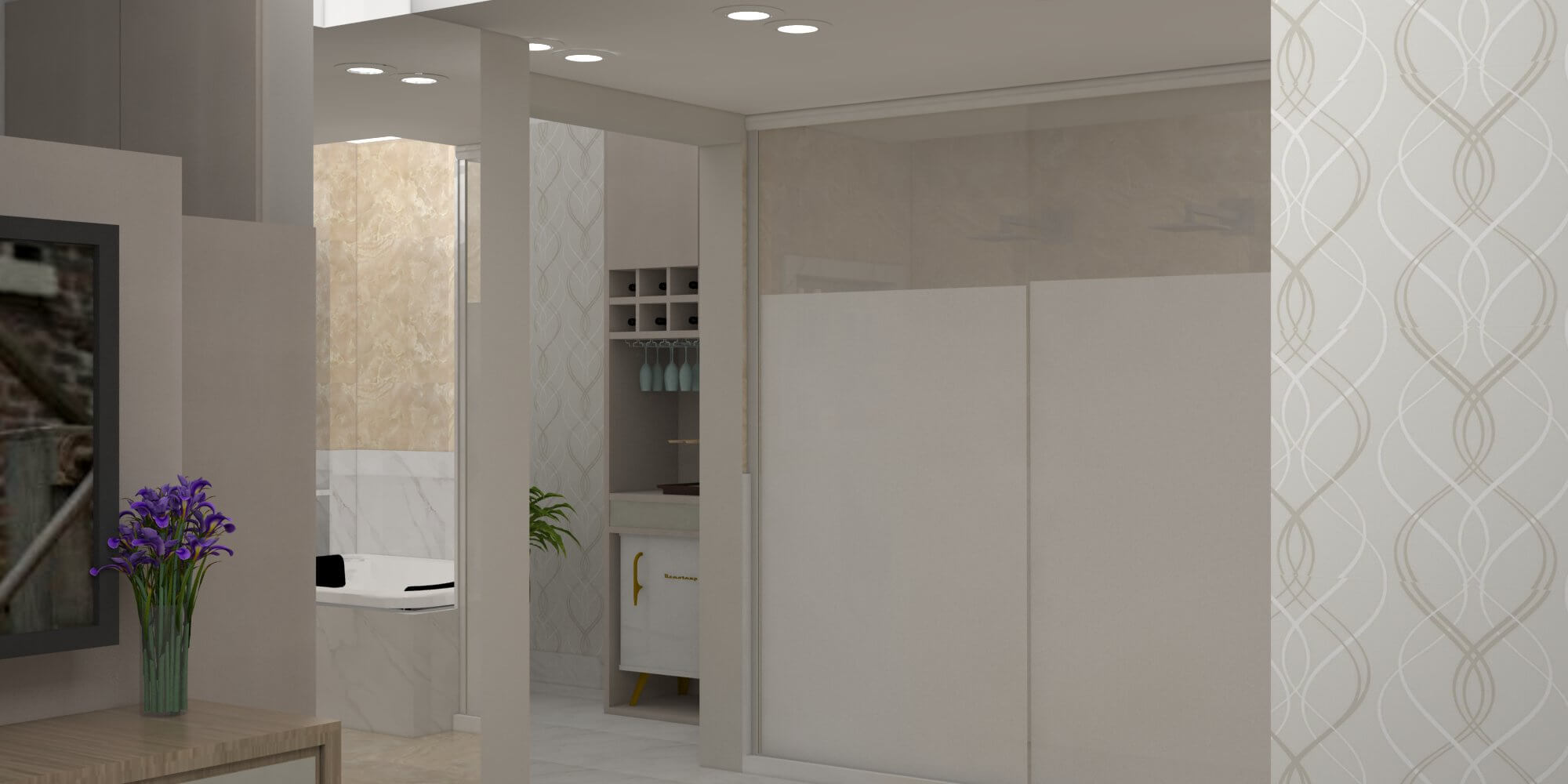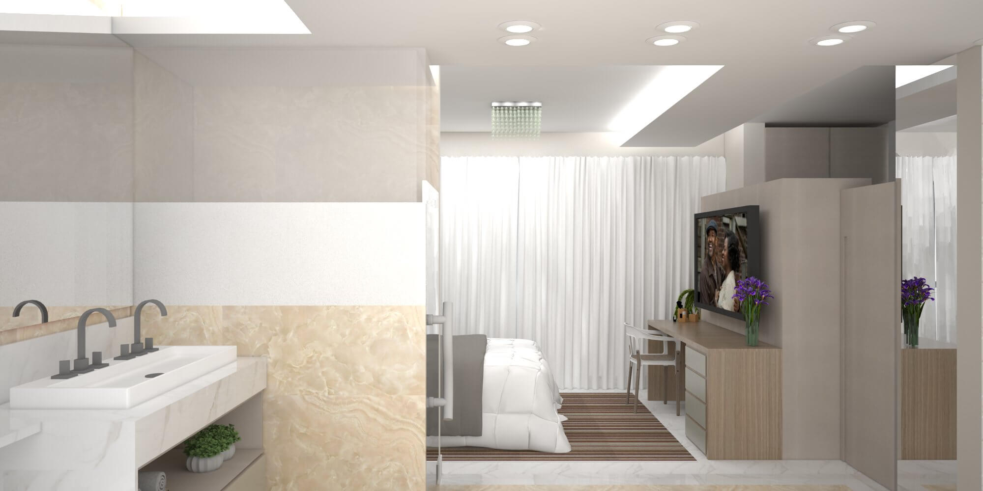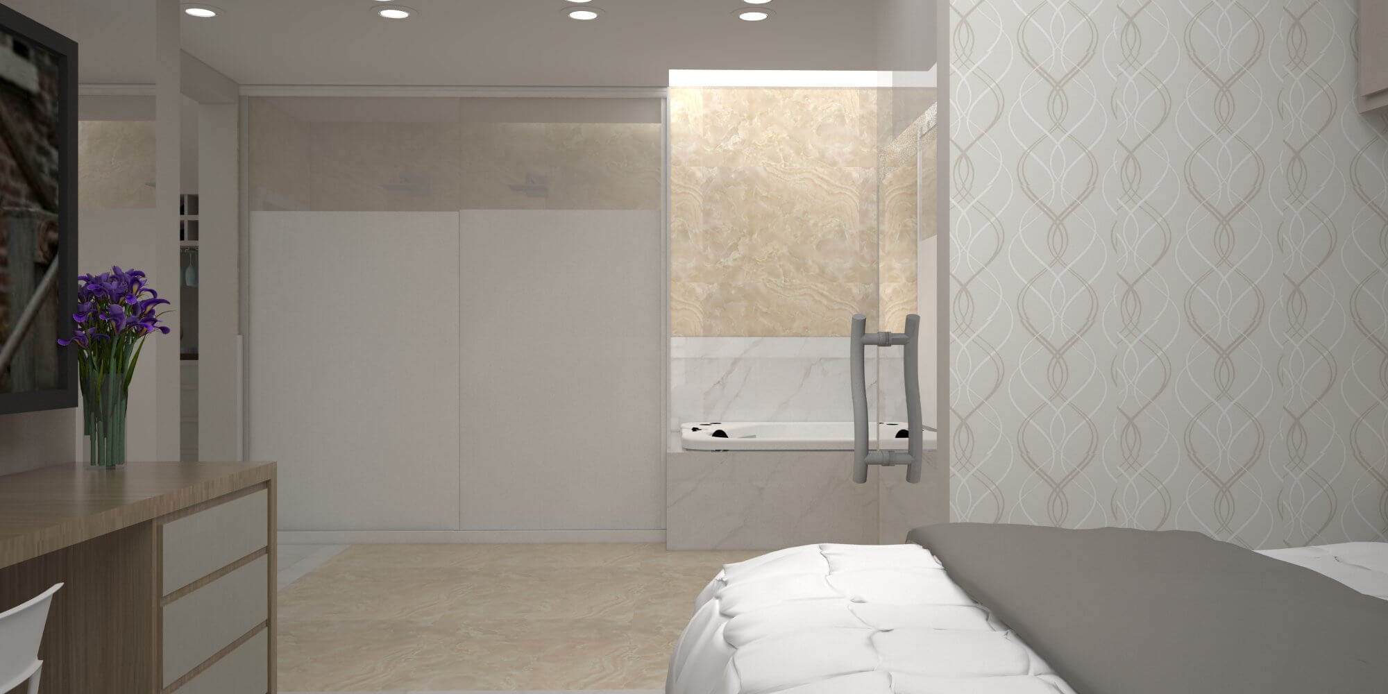 Fomos contratados às pressas por esses clientes que já estavam com a obra em andamento da construção de um anexo que seria um novo quarto para o casal. Fizemos uma modelagem 3D conforme o cliente nos pediu, bem clássico. Eles queriam verificar como ficaria a disposição dos móveis e a integração do quarto com o banheiro. Eles amaram o resultado!